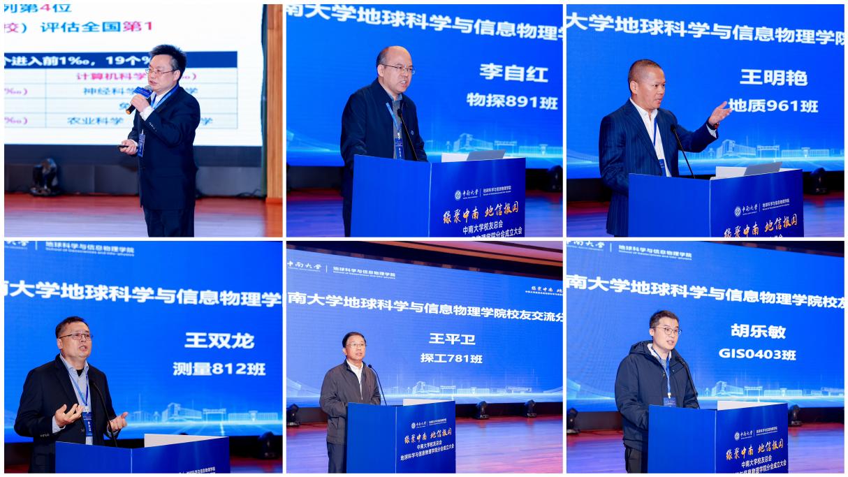 发展现状与未来规划。物探891李自红、地质961王明艳、测量812王双龙、探工781王平卫、地理信息系0403胡乐敏等校友代表依次登台,分享求学时光的难忘记忆、职场奋斗的宝贵历程与人生感悟,真挚的话语催人奋进,引发全场共鸣。